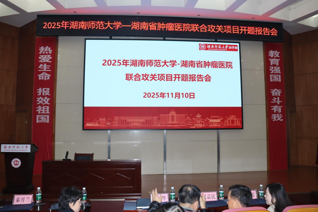 11月10日上午,湖南师范大学与湖南省肿瘤医院联合攻关项目开题报告会在湖南师范大学医学部仁医楼报告厅隆重举行。会议标志着双方共建的“湖南师范大学肿瘤研究院”进入实质性科研攻关阶段,首批11个跨学科联合项目全面启动,由医学部具体执行,旨在共同攻克肿瘤诊疗前沿难题。开题仪式由湖南师范大学医学部副主任彭小宁教授主持。医学部党工委书记、主任祝益民教授,党工委副书记鄢朝晖,湖南省肿瘤医院院长向华教授,以及双方单...