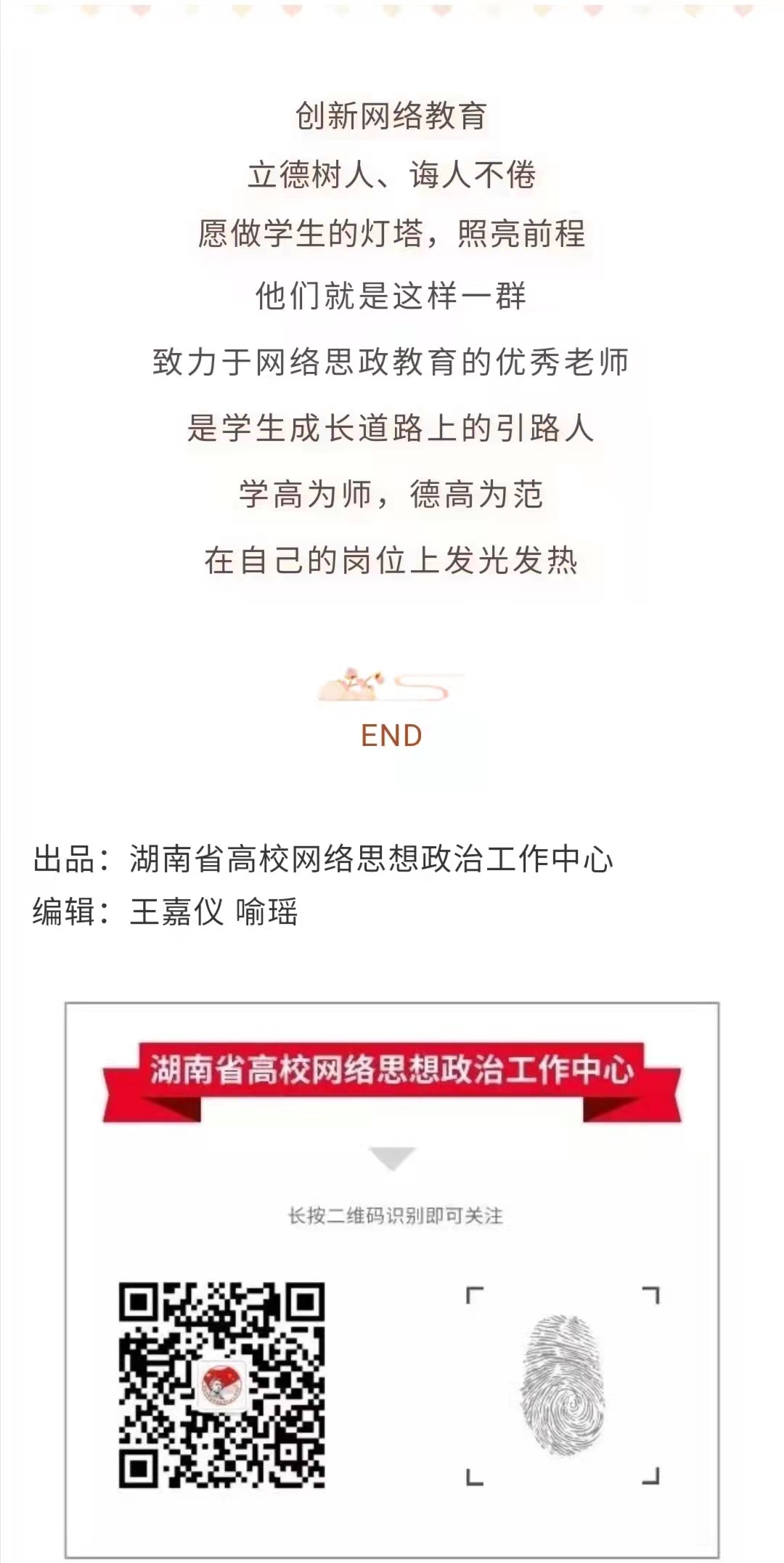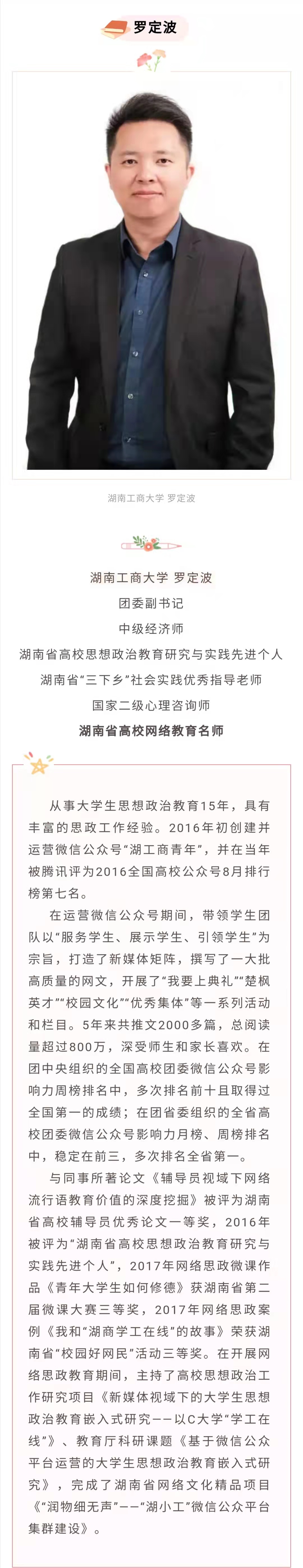 下一条:张杜豆:湖南师范大学工程与设计学院专职辅导员、中国大学生在线“小中视觉工作室”指导老师、第二批“湖南省高校网络教育名师培育支持计划”入选者