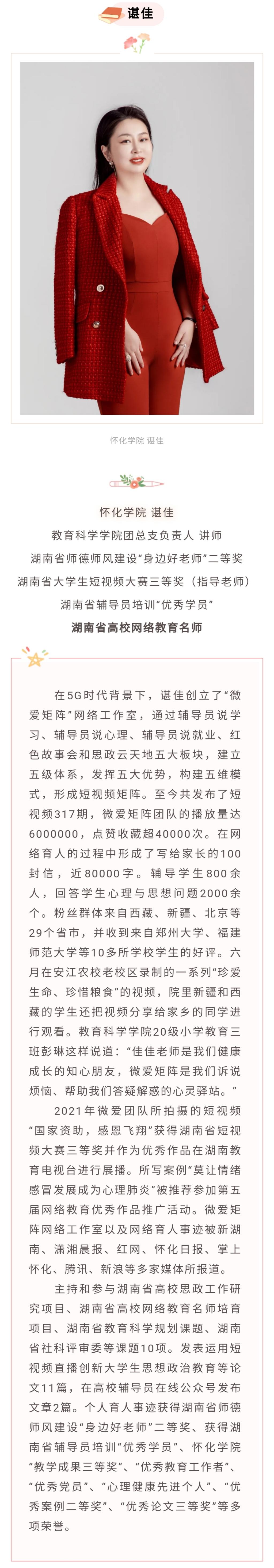 下一条:刘雯:长沙师范学院学前教育学院团总支书、国家三级心理咨询师、高级职业指导师、第二批“湖南省高校网络教育名师培育支持计划”入选者