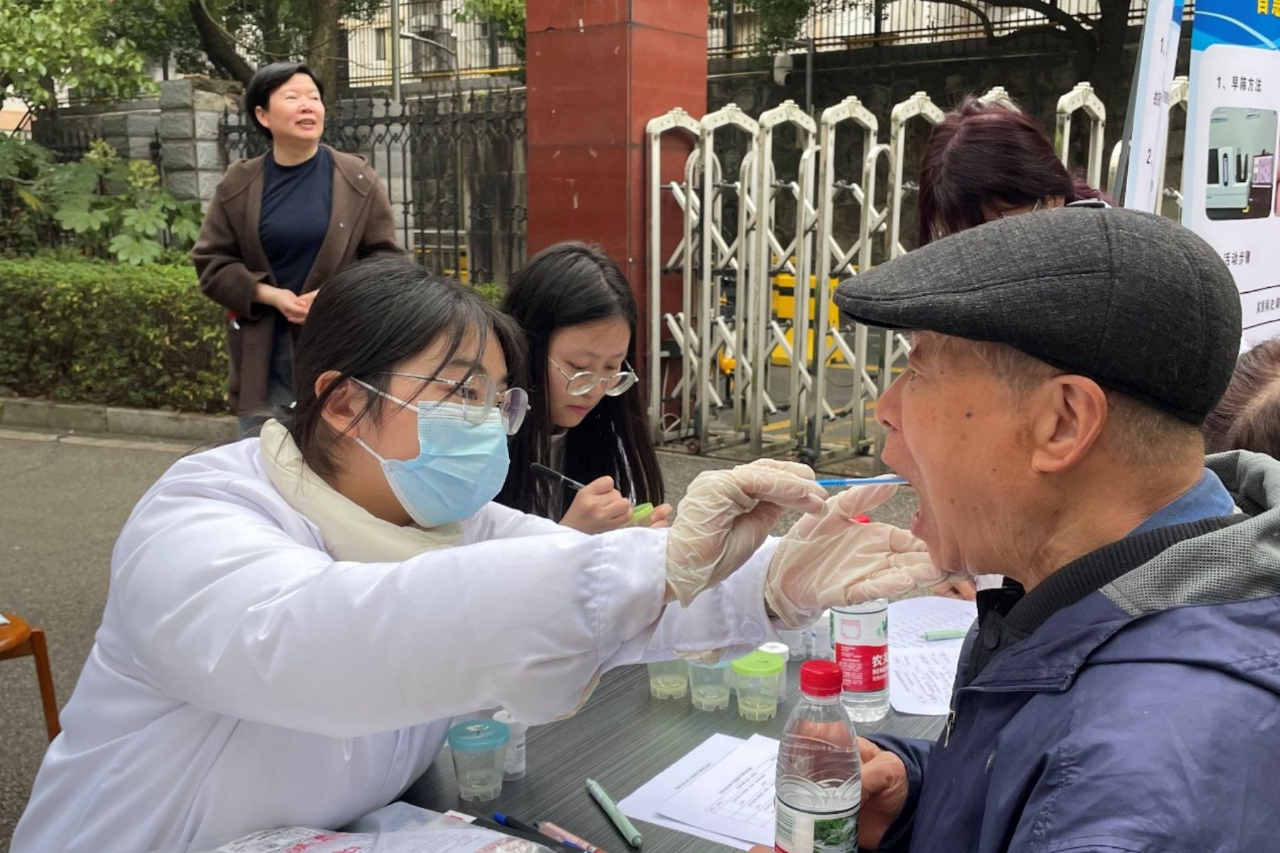 学生团队通过科普展板、宣传手册发放与现场讲解相结合的方式,向居民详细普及口腔癌的早期症状、高危因素及预防措施,尤其提醒长期嚼食槟榔等高风险人群加强健康监测、定期参与筛查。团队运用AI辅助病理诊断模型,结合传统检查手段,为社区居民开展口腔黏膜检查,对疑似病例进行详细记录并给予专业转诊建议,推动实现“早发现、早诊断、早治疗”的健康管理闭环。
