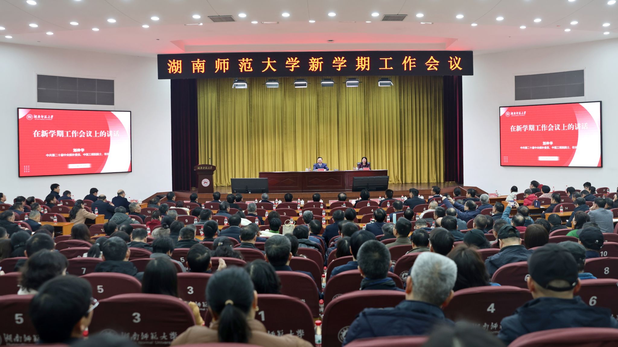 刘仲华向全校师生致以新年的美好祝福。他从党建和思政工作、学科建设、人才培养、队伍建设、科学研究、社会服务、国际交流合作、改善办学条件等八个方面总结了2024年学校取得的主要成绩,肯定了全校师生做出的努力与贡献。他分析了2025年学校发展面临的形势,部署了新学期重点工作:一是要持续实施人才强校战略,巩固事业发展根基。大学发展的核心在于人才。近年来,学校深入实施人才强校战略,形成了“近者悦、远者来”的人才建设新格局,为学校“双一流”建设聚集了源源不断的动能。下一步,要构建更加有力的青年人才支持体系、推出更加有效的青年人才激励机制,营造更加浓郁的关心青年人才、帮助青年人才、支持青年人才的氛围,持续建强青年人才队伍,不断完善人才梯队结构,努力打造青年才俊云集、扎根、奉献、成长的沃土。二是要优化学科专业布局,推动产学研用深度融合。要锚定一流,实施高原造峰行动。扎实推进高原学科内涵式建设,统筹学科资源,做好整合文章。要服务需求,开展学科专业调整优化。要聚焦科技创新,推动产学研用深度融合。学科专业调整优化事关学校前途命运,全校上下务必统一思想,将学科专业调整优化作为学校当前一项极端重要的工作来抓。三是要大力推进教育数字化,塑造教育教学新形态。要聚焦人才培养,深化数字化教育改革。构建数字化“三全”育人体系和数字化教学新生态,建好数字化学习资源,构建智慧化教学评价体系。要坚持“应用为王”,以数字赋能高效能科研。围绕科研需求,打造科研数字基座;重塑科研组织范式,赋能跨学科协同创新;搭建数字转化桥梁,推进产学研用一体化。要激活数据价值,形成智慧治理新样态。建设全域数据中心,建立便于执行的校级数据标准;善于运用数据,释放数据要素价值;深化“一网通办”改革,大力推进“一张表”“一次办”“一码办”服务。四是切实加强党建引领,夯实事业发展政治保障。坚持以党的创新理论凝心铸魂,坚持理论学习与研究并重,抓好党的创新理论“三进”工作,落细落实意识形态工作。推动基层党建全面进步过硬,不断完善基层党建组织体系,切实建强党员队伍,扎实推进“对标争先”。推动全面从严治党向纵深发展,持续巩固党纪学习教育成果,坚决筑牢师德师风底线,扎实做好未巡先改。他还强调,要积极推进机构编制改革、二级学院年度业绩考核和全员考核、施行学校公共资源的有偿使用等工作。他指出,当前学校发展进入新的阶段,面临着新的挑战、新的困难,也同样孕育新的机遇、新的希望。他期望全校师生提高政治站位,坚持问题导向、目标导向和结果导向,鼓足干劲、真抓实干,结合学校重点工作任务明确本单位年度工作要点,高质量推进各项工作落实,合力开创学校高质量发展新局面。