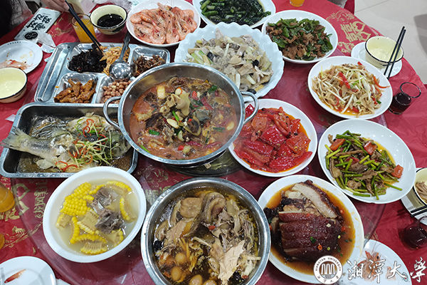 今年湘潭大学有154名学生留校过年,学校在南苑师生餐厅二楼准备了22桌,每桌12个主菜、1份四小蝶和1份点心,并且为照顾饮食习惯,准备了2桌清真餐。