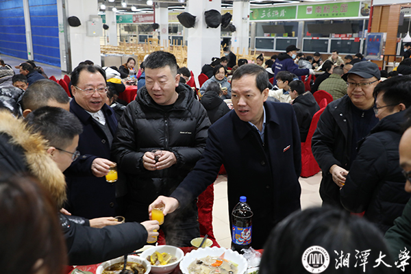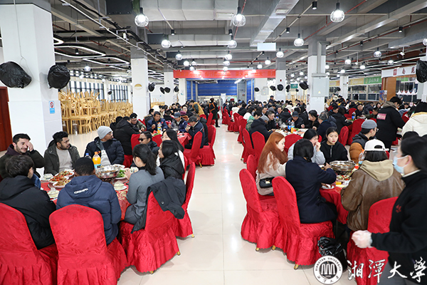 2月7日,受连日低温雨雪影响,湘大校园的树木挂上了长长的冰凌,寒意袭人。南苑师生餐厅二楼内却暖意融融,充满欢声笑语,学校在这里为留校学生举办迎新年团圆宴。校党委书记刘起军、副校长肖志伟、刘建平教授等与大家共聚一堂,以餐叙迎新年,向大家传递来自学校的关怀和问候。