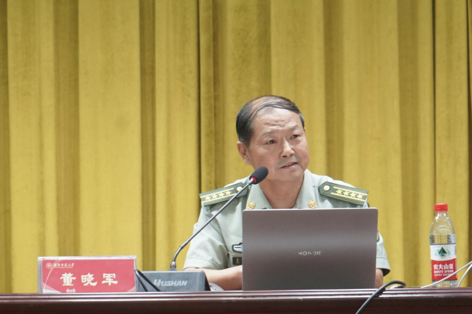 (通讯员 陈艺婷 吴波)10月14日下午,一场主题鲜明、内容丰富的“国防教育第一课”在我校国际学术报告厅成功举行。此次活动由学生工作部、武装部组织,湖南省国防动员办公室会同省人防协会协助开展。活动特邀原国防科技大学军政基础教育学院军事学教授董晓军来校,作了以《利剑擎天慑四方铁甲洪流震八荒——93大阅兵新装备探秘》为主题的专题授课。学生工作部、武装部部长陈文雄,学生工作部、武装部副部长段婷出席活动,300余名师生代表参与学习。