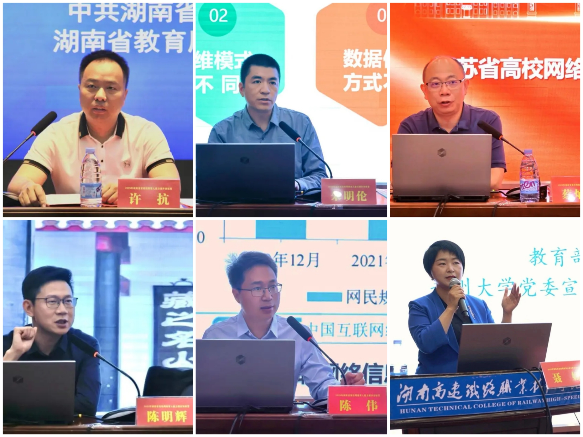 本次训练营共设置5场专题讲座、1场“湘思育人•思享会”。教育部易班发展中心主任、总裁朱明伦,教育部高校网络教育名师、华中农业大学马克思主义学院副教授陈明辉,教育部高校网络教育名师、南京师范大学保卫部部长蔡炳锋,教育部高校网络教育名师、电子科技大学宣传部副部长陈伟,教育部高校网络教育名师、郑州大学宣传部副部长聂娜先后围绕思政教育数字化、党的创新理论宣讲、高校网络育人共同体构建、优质网络内容供给、网络育人的内在逻辑与外部协同等主题开展授课。第三批“湖南省高校网络教育名师培育支持计划”入选者分别就项目推进情况、工作成效与经验、未来工作规划等方面开展分享交流。