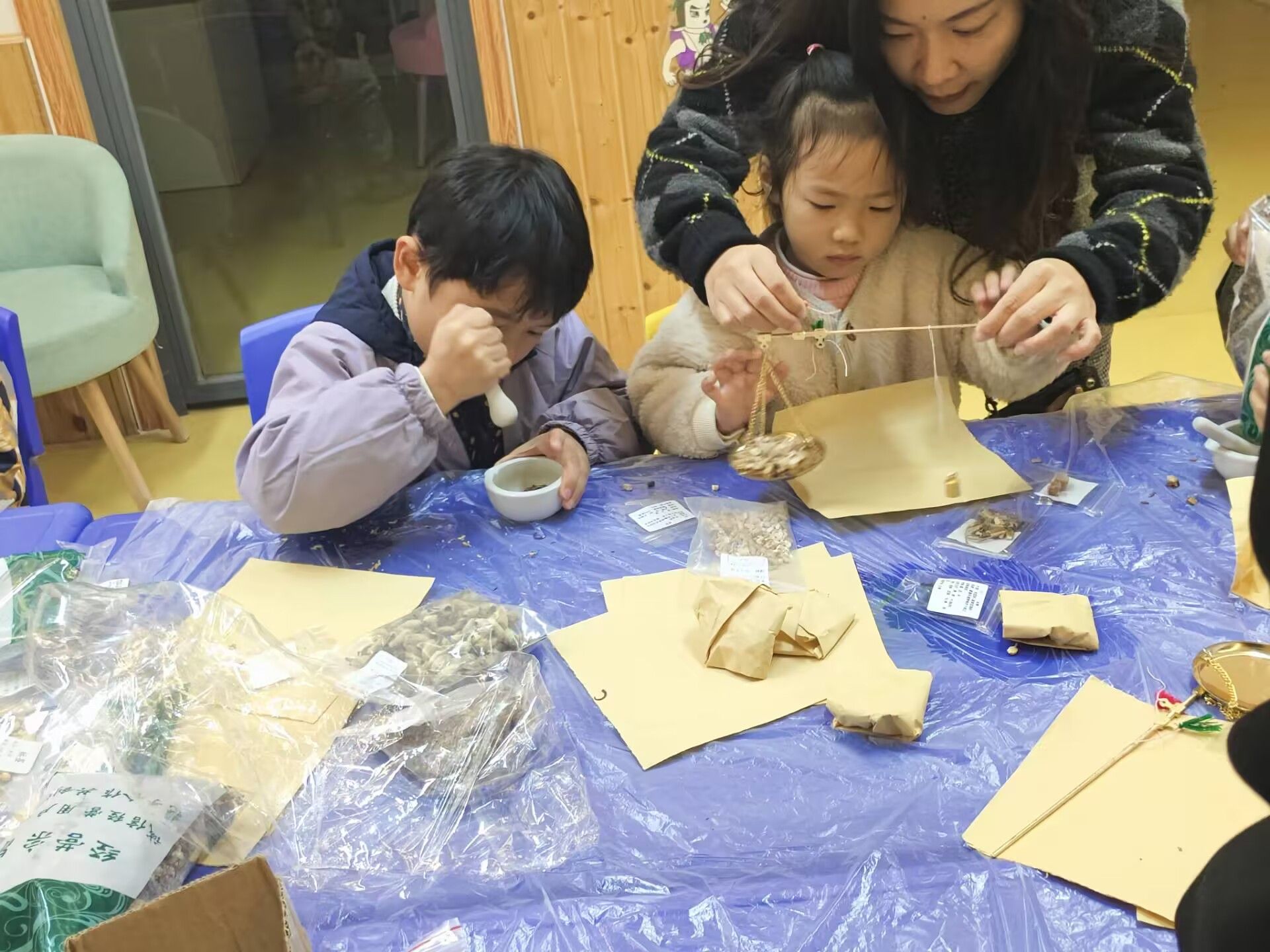 在志愿者的引导下,小朋友们学会了研磨、称量和包装中草药,不仅学习到了关于中草药的丰富知识,了解了药用价值和使用方法,还感受到了传统医药文化的独特魅力和深厚底蕴。