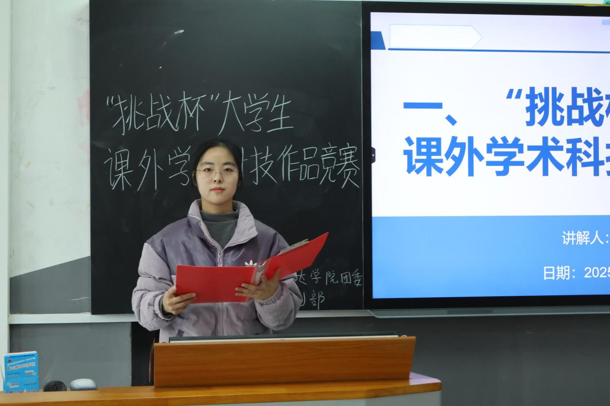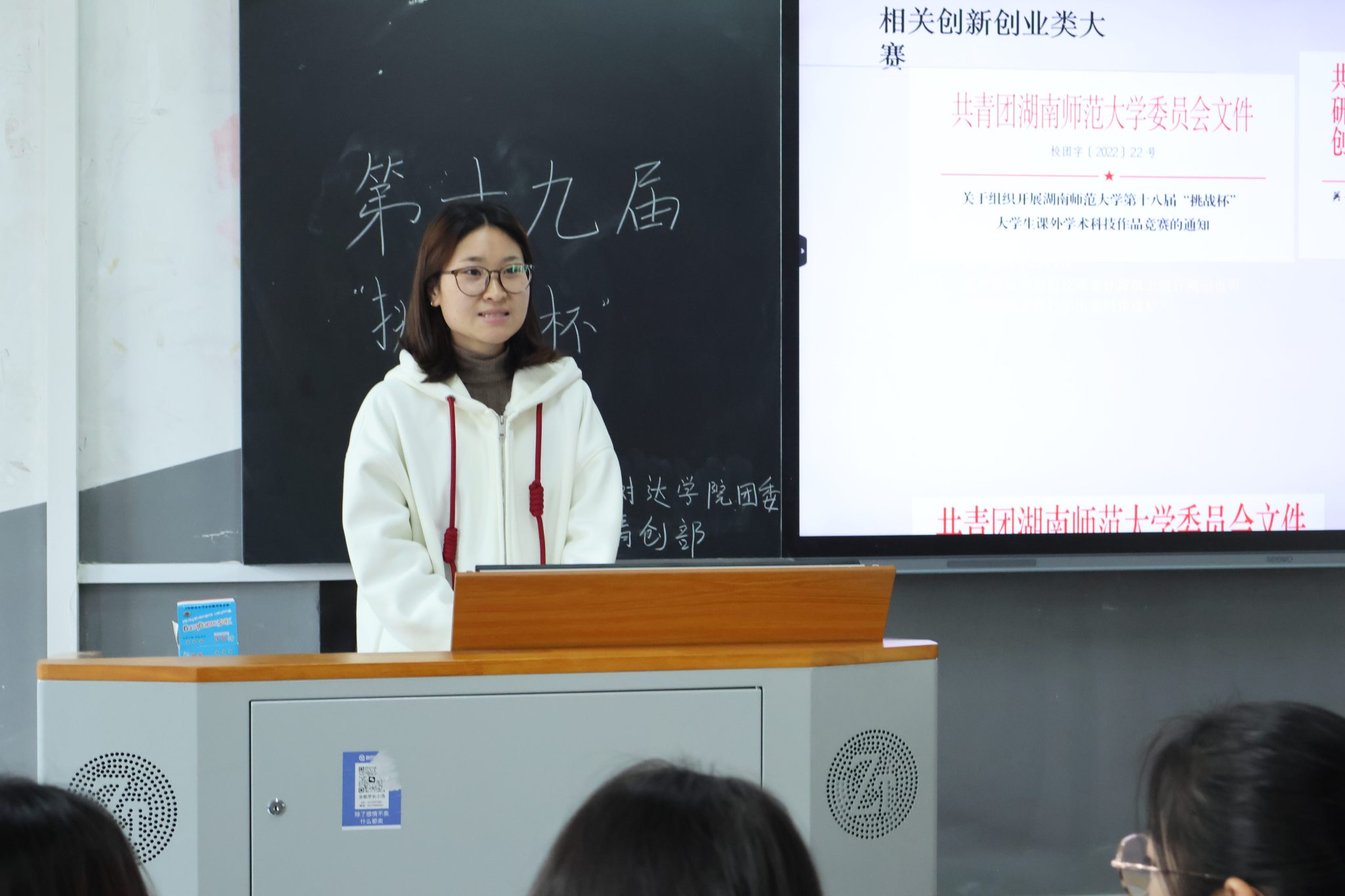 (通讯员 刘紫琼 向媛钰 周劲翔)2月28日中午,团委青年创新创业指导部在树达楼115教室开展学院第十九届“挑战杯”大学生课外学术科技作品竞赛宣讲会。2021级电子信息科学与技术专业易雨担任主讲人。