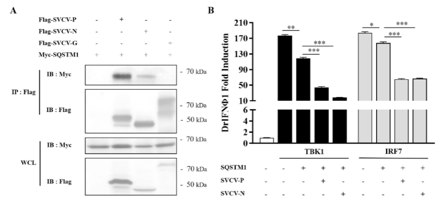 选择性自噬受体p62/SQSTM1是一种多功能支架蛋白,能够通过识别并结合泛素分子标记的靶蛋白,将其转运至自噬体并降解。已有研究表明,p62/SQSTM1参与多种免疫因子的调控,包括RIG-I、cGAS、MAVS、STING和IRF3。然而,p62/SQSTM1在硬骨鱼抗病毒免疫中的作用有待深入探究。