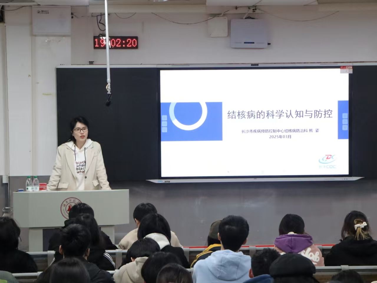 (通讯员 刘婷 蒋雯 任浩楠)3月19日晚上,长沙市疾病预防控制中心熊姿、校医院全宏姣分别在树达楼315、415教室开展了以“结核病的科学认知与防控”为主题的讲座。