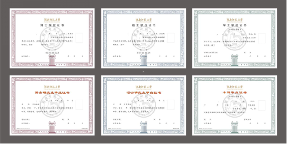 我校于2016年初启动学位证书、毕业证书自主设计工作。我校美术学院和工程与设计学院经验丰富的设计专家牵头,经有关专家对设计方案的多轮客观、公正的意见反馈和评选,结合全校师生网上投票结果,校长办公会议最终确定了湖南师范大学新版学位证书、毕业证书的版式。新版证书在设计上强调庄重、简洁,注重内涵,体现师大特色,版式说明如下: