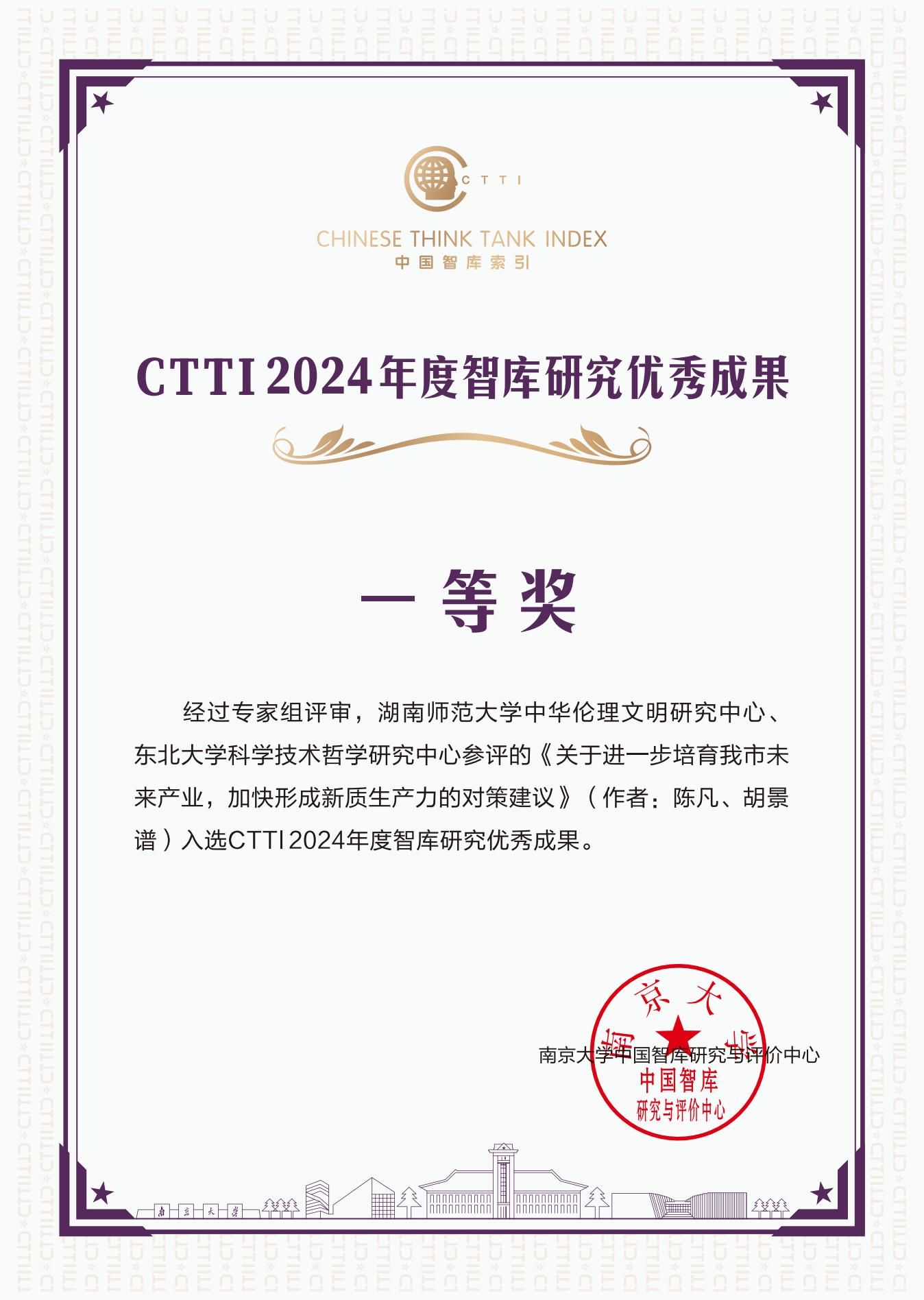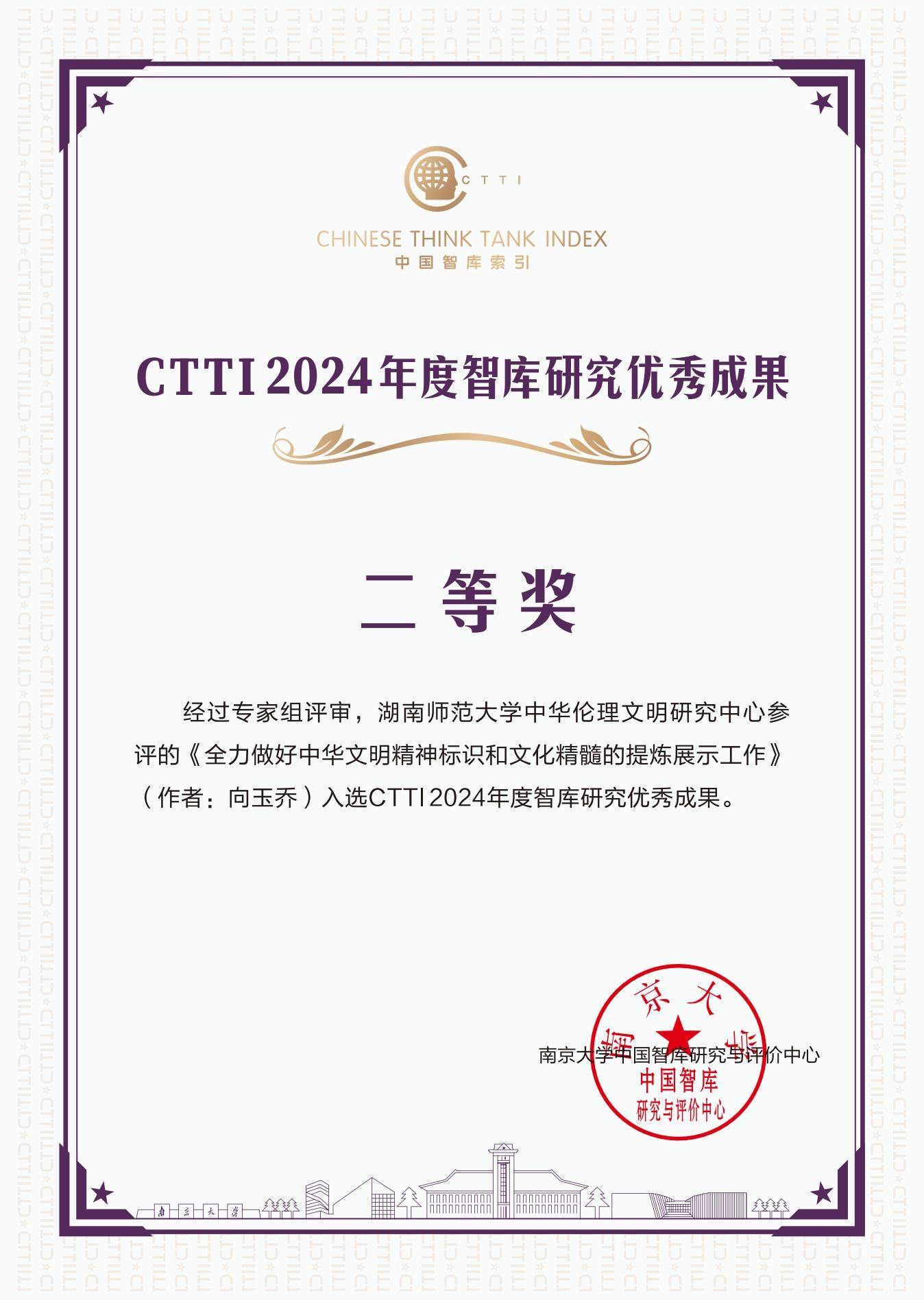 论坛发布了中国智库索引(CTTI)2024年度增补来源智库名单、2024年度智库研究优秀成果名单。湖南师范大学中国乡村振兴研究院被遴选为中国智库索引CTTI新增来源智库,推荐的《湖南巩固拓展脱贫攻坚成果与乡村振兴有效衔接研究》荣获CTTI 2024年度智库研究优秀成果特等奖;中华伦理文明研究中心推荐的《关于进一步培育我市未来产业,加快形成新质生产力的对策建议》荣获CTTI 2024年度智库研究优秀成果一等奖,《全力做好中华文明精神标识和文化精髓的提炼展示工作》荣获CTTI 2024年度智库研究优秀成果二等奖。