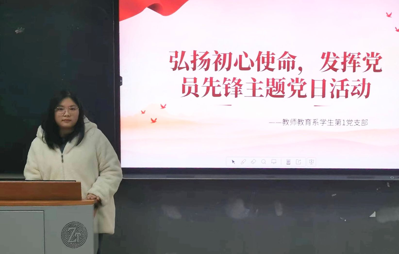 (记者 胡可曼 吴语彤 丁弘宇)1月17日中午,我院教师教育系学生第一党支部在达善楼205教室开展以“弘扬初心使命,发挥党员先锋”为主题的党日活动。活动由教师教育系学生第一党支部组织委员林纯主持。