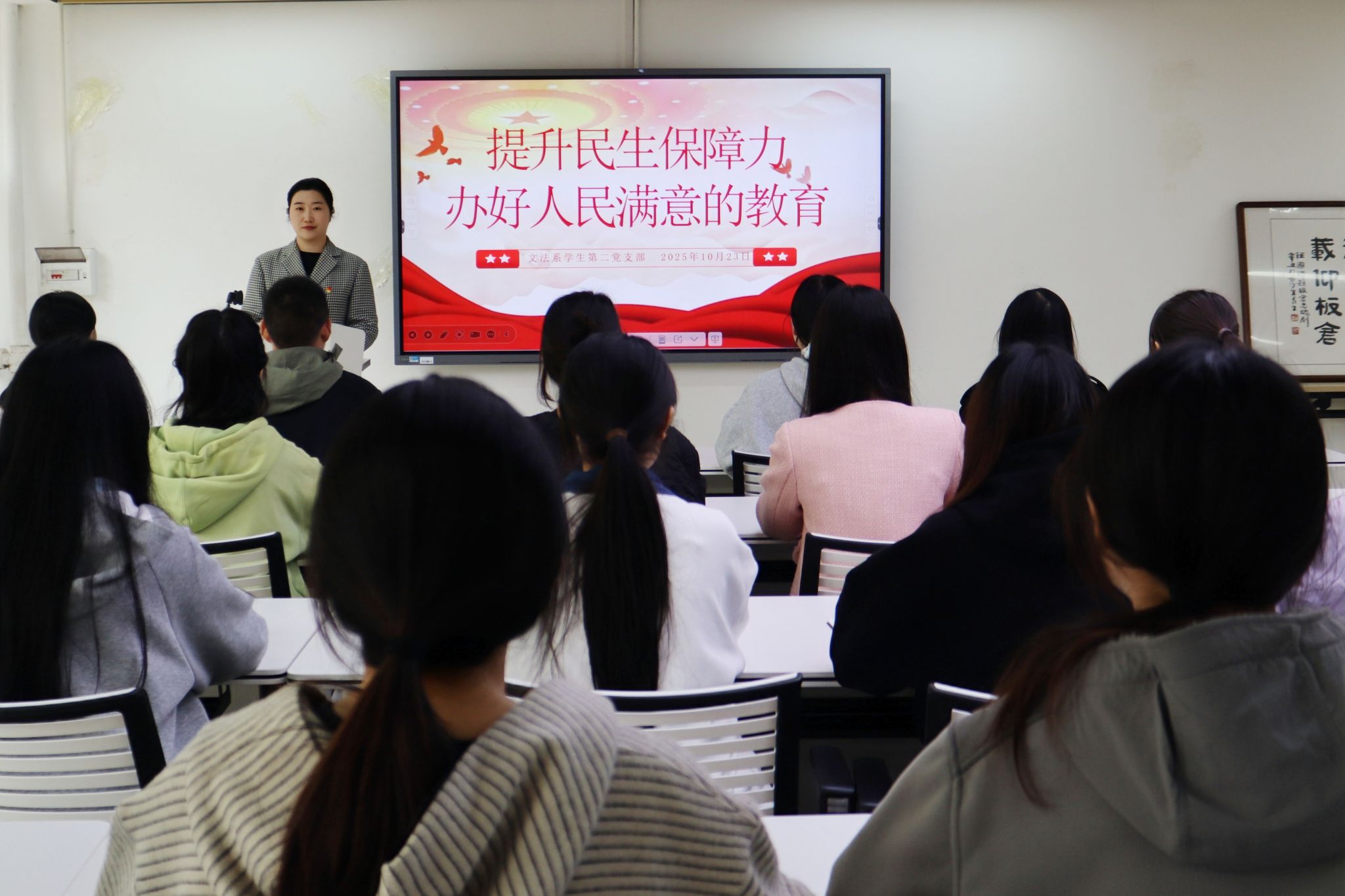 (通讯员 沈思琪 席琴 吴思桥)10月23日中午,我院文法系学生第二党支部在党员之家开展以“提升民生保障力,办好人民满意的教育”为主题的党日活动。文法系学生第二党支部书记彭娇出席并主持会议。