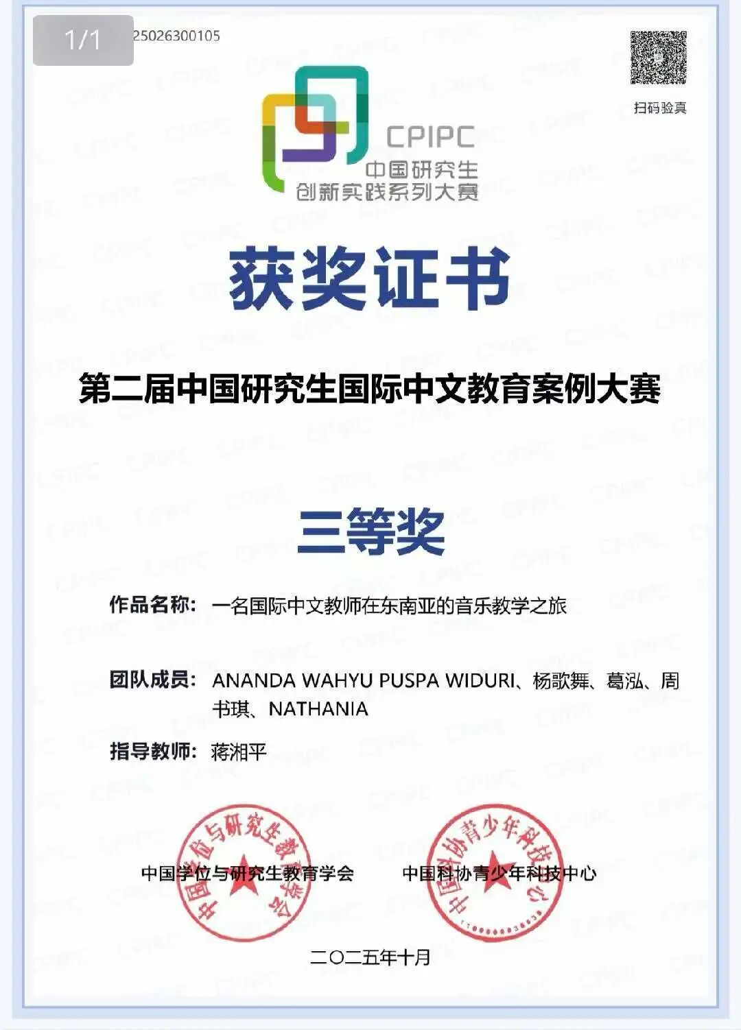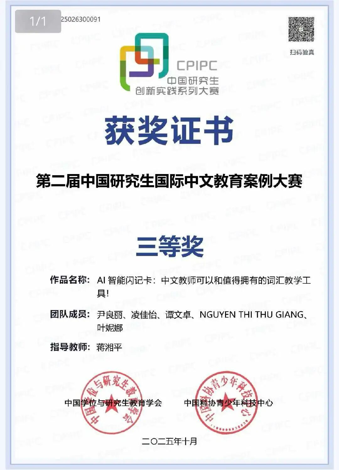 第二届中国研究生国际中文教育案例大赛于2025年10月在上海圆满结束,有来自285所中外院校的学生组成的854支团队参赛,共提交作品805个(含港澳赛区)。国汉院蒋湘平老师指导研究生在该赛中获二等奖1项、三等奖2项。在智慧中文赛道,案例作品《1+1+1+1>4:AI+同伴+自主+教师的“四步修改法”让写作修改更高效》(团队成员:张锐、冀文秀、李璐)获二等奖;案例作品《AI智能闪记卡:中文教师值得和可以拥有的词汇教学工具》(团队成员:尹良丽、凌佳怡、谭文卓、NGUYEN THI THU GIANG、叶妮娜)获三等奖。在海外本土赛道,案例作品《一名国际中文教师在东南亚的音乐教学之旅》(团队成员:ANANDA WAHYU PUSPA WIDURI、杨歌舞、葛泓、周书琪、NATHANIA)获三等奖。