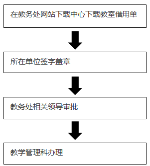 在教务处网站下载中心下载教室借用单→所在单位签字盖章→教务处相关领导审批→教学管理科办理。