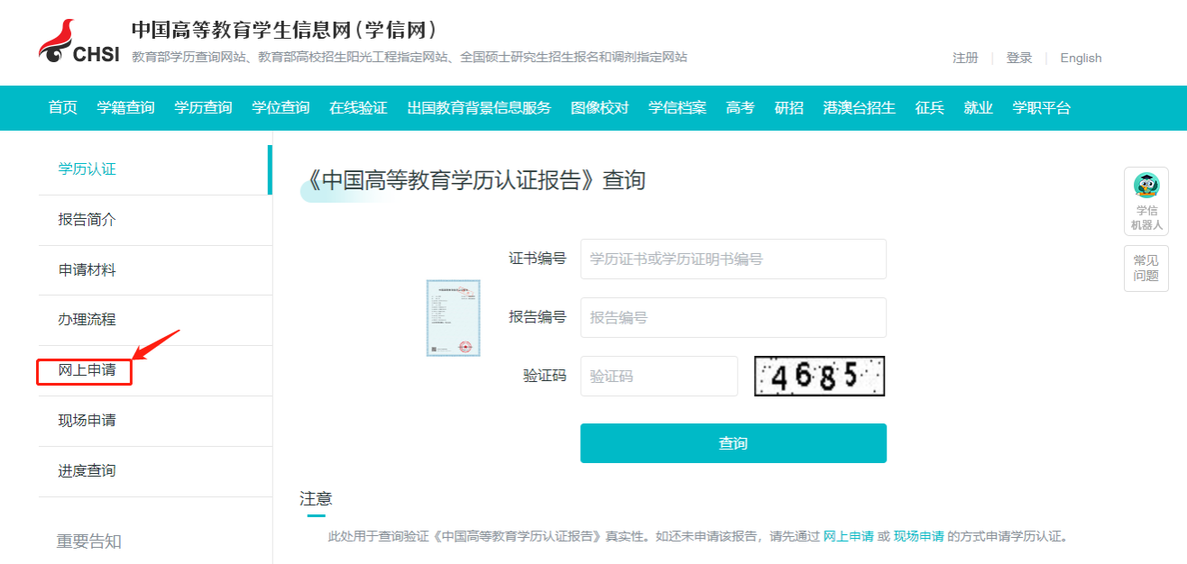 https://www.chsi.com.cn/直接进行学历认证,步骤如下:点击“学历认证”-“网上申请”-“点击进入网上申请系统(Start an Application)”,实名注册后登录系统,按系统提示上传毕业证、身份证原件,待学历认证中心审核后,打印学历认证报告。具体操作如图: