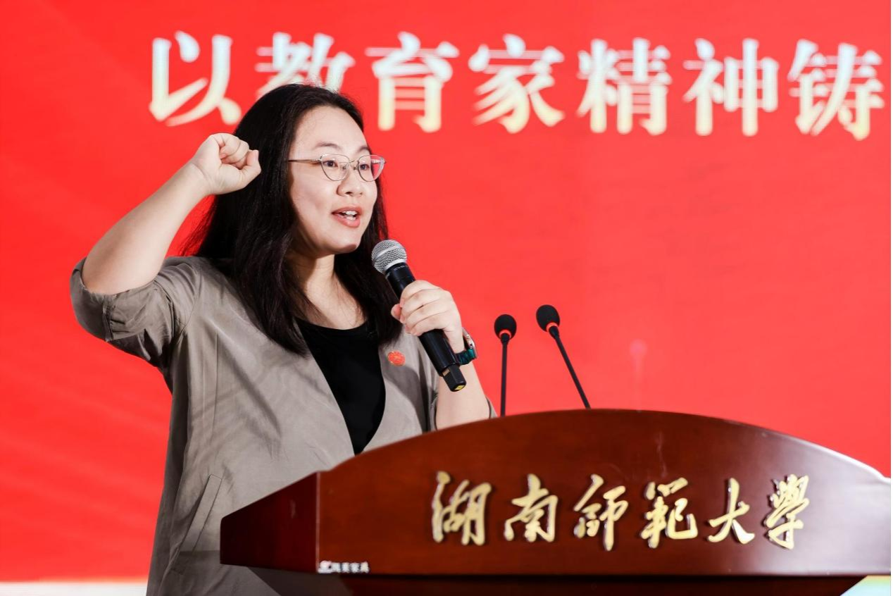 教职工代表、音乐学院新进教师王艺璇博士发言。她为能够加入湖南师范大学感到骄傲和幸福,并分享了自己的感悟:一是要持续精进学业,做学习的笃行者;二是要矢志修身养德,做学生的引路人;三是要扎根艺术实践,做时代的歌唱者。她承诺将以热忱之心投身教学科研,以创新之心拥抱时代变革,传承学校优良传统,为学校发展贡献自己的力量。