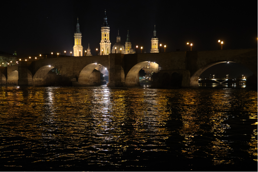 萨拉戈萨古石桥和皮拉尔大教堂的夜景