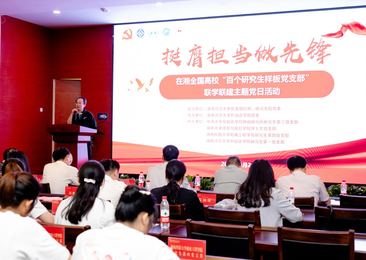 据悉,“挺膺担当做先锋”——在湘全国高校“百个研究生样板党支部”联学联建活动由湖南师范大学党委组织部、研究生院党委指导,湖南师范大学外国语学院党委承办,中南大学基础医学院肿瘤研究所研究生第三党支部、湖南大学建筑与规划学院博士生党支部、湖南科技大学机电工程学院研究生第四党支部、湖南师范大学外国语学院研究生第一党支部和湖南师范大学党委组织部、党校党支部参加联学联建,通过支部共建、经验共享,不断增强党支部在思想政治引领、团结凝聚研究生等方面的战斗堡垒作用,带动湖南省高校研究生党支部全面进步、全面过硬。
