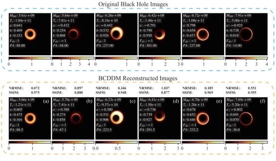 通过将事件视界望远镜(EHT)数据拟合到通过广义相对论射线追踪(GRRT)生成的模拟图像中,可以推断黑洞和吸积流的性质。然而,由于GRRT的计算密集性,生成特定辐射通量图像的效率需要提高。针对黑洞成像领域的这一难题,团队历时一年攻关,创新性地将人工智能技术融入了黑洞物理的研究。这种方法首次通过扩散架构实现物理参数到黑洞图像的端到端生成,在极大程度降低传统方法算力需求的同时,生成的图像与真实GRRT模拟高度一致,且能准确反映输入参数的变化。此外,通过生成的图像增强训练数据后,基于深度学习的参数回归模型在黑洞物理参数预测上取得了性能显著提升。该研究为黑洞图像的研究提供了一种快速、精准、低成本的AI驱动新范式。