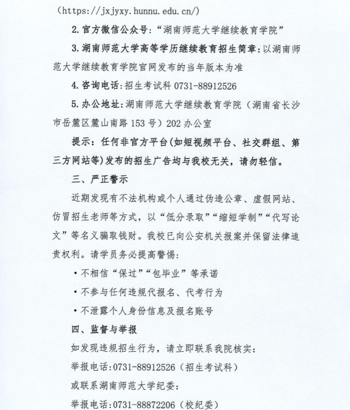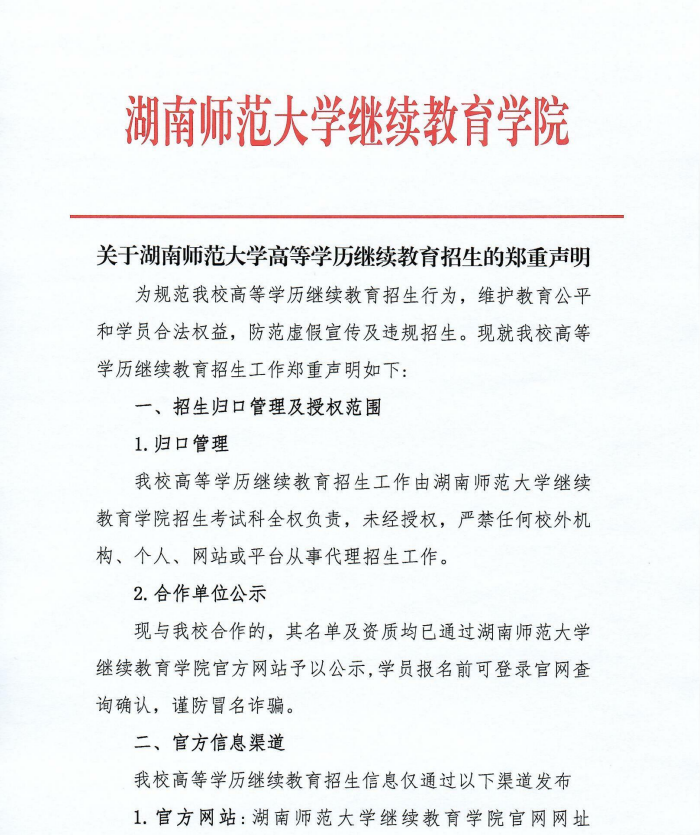 关于湖南师范大学高等学历继续教育招生的郑重声明