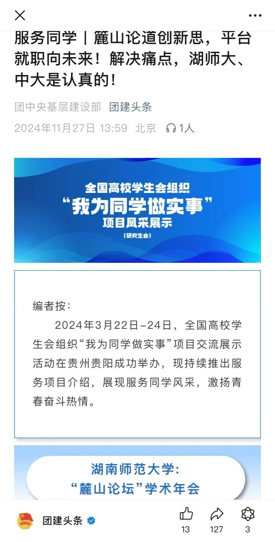 在首届全国高校学生会组织“我为同学做实事”项目交流展示活动中,我校“麓山论坛”学术年会脱颖而出,荣获全国精品项目的殊荣。近日,我校喜报再临,官方微信公众号“湖南师大研究生团委研究生会”发布的“麓山论坛”深度报道,获共青团中央基层建设部官方公众号“团建头条”转发点赞,尽显我校学术盛事的风采与影响力。不仅进一步提升了“麓山论坛”的品牌影响力与知名度,更标志着“麓山论坛”学术年会赢得了共青团中央层面的高度认可与赞誉,为学校在青年工作实践与学术创新探索的道路上树立了又一崭新的里程碑。