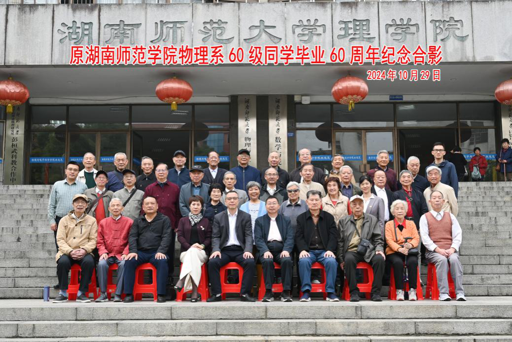 (供稿:物电院学工办)10月29日,湖南师范学院物理系60级校友回母校举行毕业六十周年欢聚活动。湖南师范大学原副校长匡乐满、校友总会副秘书长贺慧星、物理与电子科学学院院长刘红荣、院党委书记罗嵘、院党委副书记郭铭伟、副院长李友明、专职组织员吴浪波等出席聚会。活动由60级校友刘务本主持。