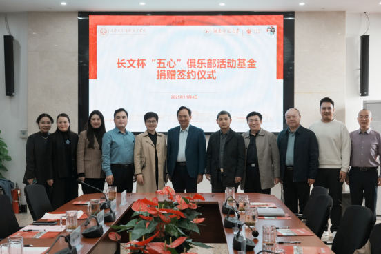 11月4日下午,我校与长沙文创艺术职业学院在教育科学学院七楼会议室隆重举行“长文杯‘五心’俱乐部活动基金”捐赠仪式。我校教育科学学院校友、长沙文创艺术职业学院理事长黄平一行,我校教育基金会秘书长黄丽萍、学生工作部、武装部部长陈文雄、团委副书记胡滢、教育基金会副秘书长刘芸玲及教育科学学院院长刘铁芳、党委书记向发意、学前系曹中平教授等出席签约仪式。